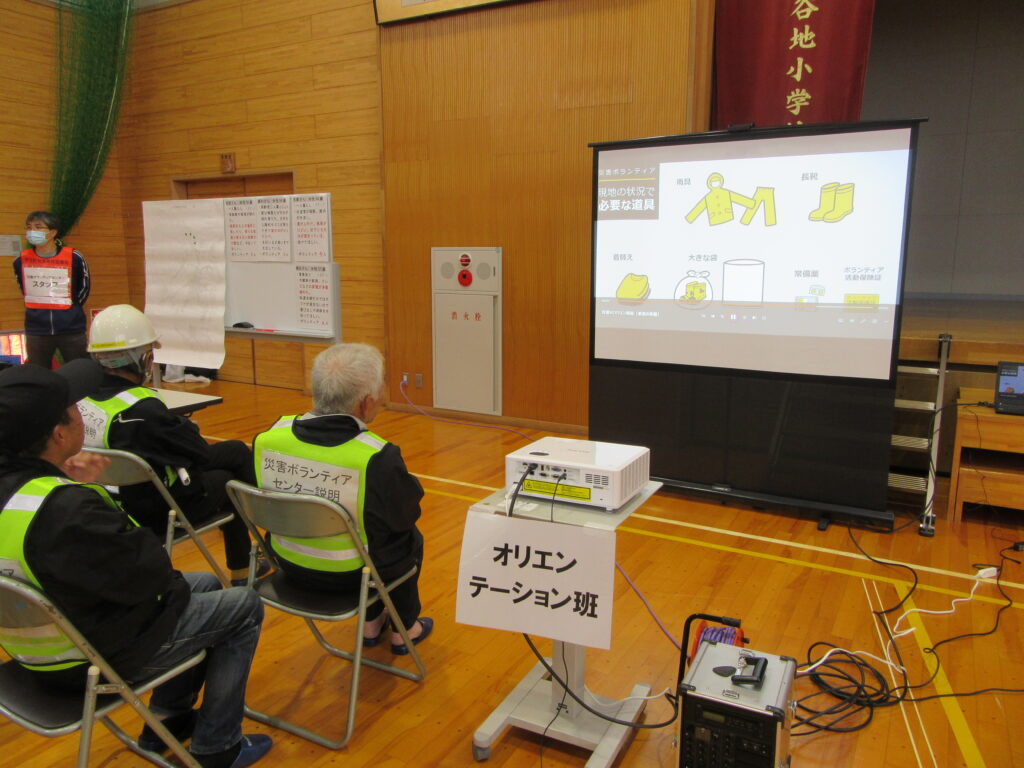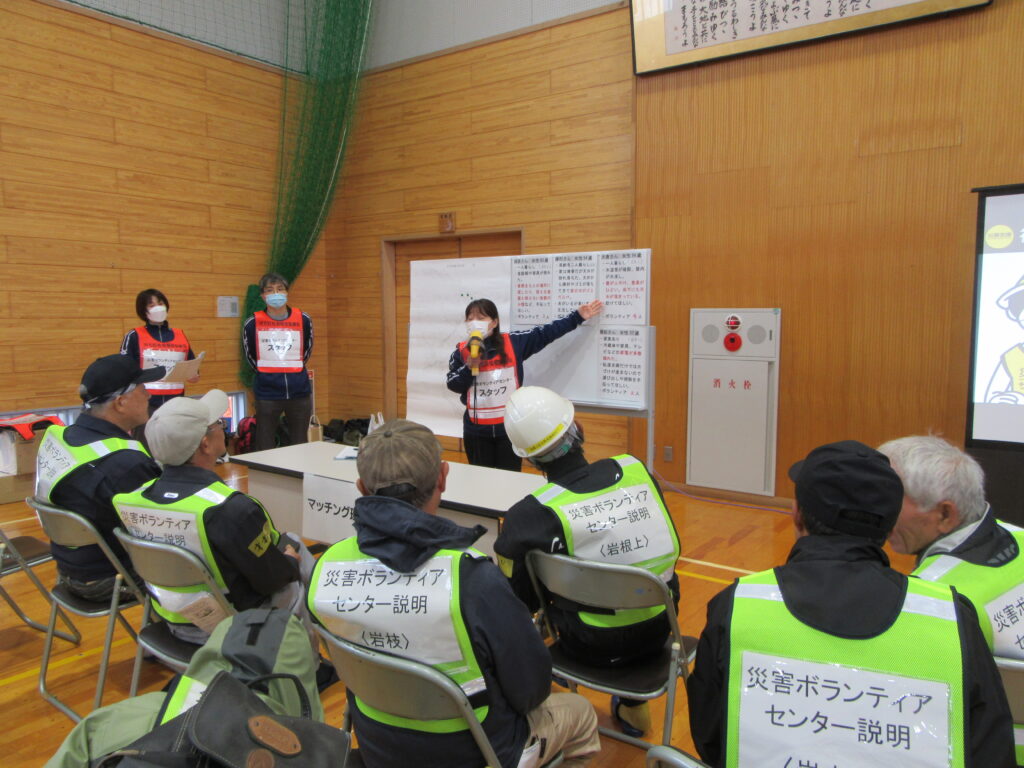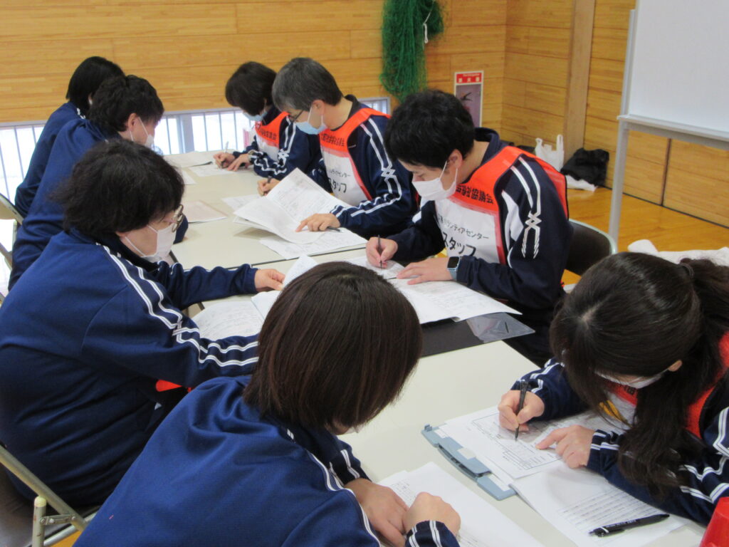 このたびの総合防災訓練は地震を想定しての訓練で、災害ボランティアセンターではニーズ聞き取り訓練を社会福祉協議会職員で行い、ボランティア受付訓練では住民の方々からボランティア役になっていただき、災害ボランティアセンターを体験していただきました。訓練の中で、ニーズ調査の重要性やボランティアの受け入れ、送り出しについて学び、また再確認しました。