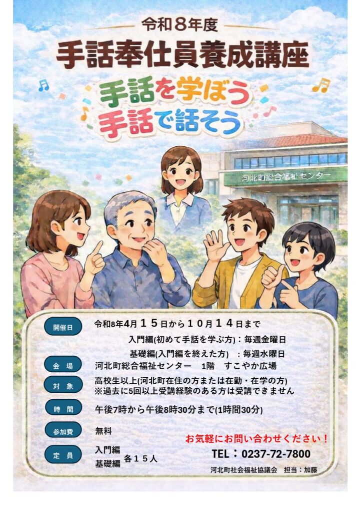地域で支え合う力を育てる講座です。手話に関心のある方、学んだことがない方、どなたでも参加をお待ちしております。医療・介護の現場で働いている方の参加も大歓迎です。